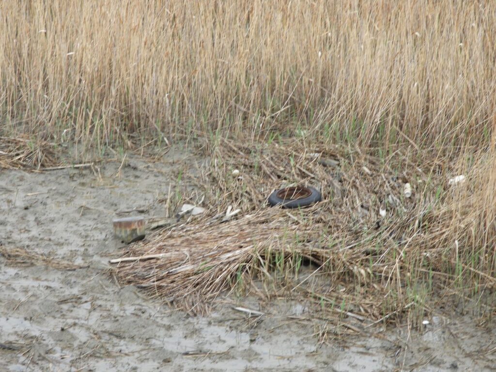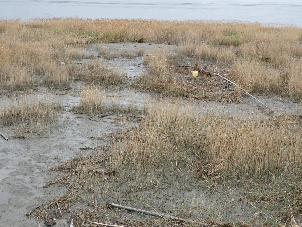 シオマネキたちが活動をはじめた4月、2週連続の週末低気圧の強風と高波によって、干潟に流木やヨシ片が漂着して困っています。